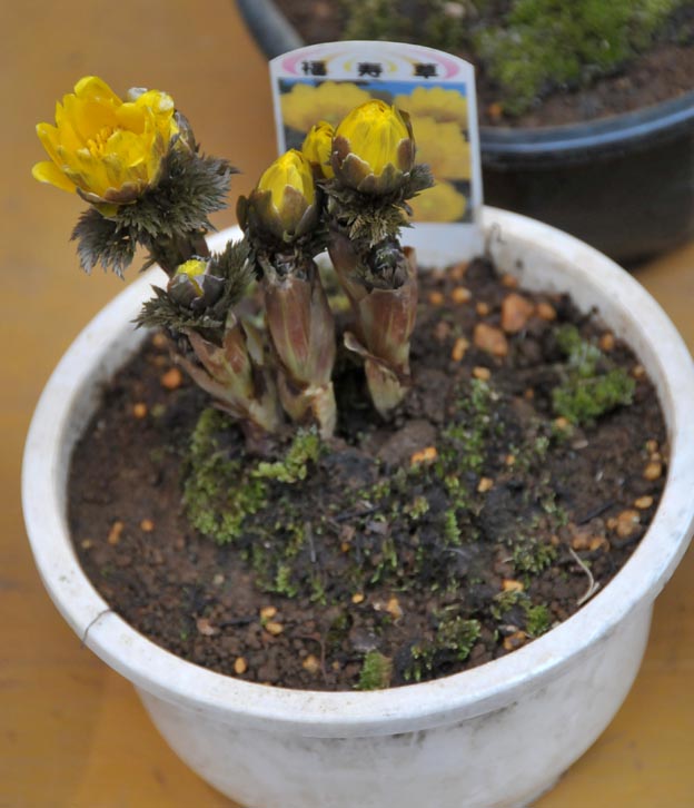 参道の露店の一軒、植木を売る店には早春の代名詞「福寿草」がありました。